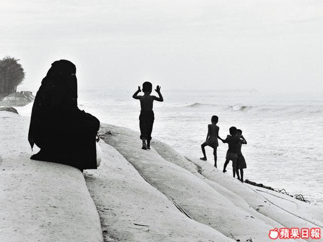 P︰我最喜歡一張在孟加拉拍攝的照片,相中人是個坐在海邊的伊斯蘭女人。這女人全身被黑紗裹住,看如此幽美的風景,也只能露出一雙眼睛,這個畫面,,,,,令我想到一種套在她身上的無形枷鎖,加上這是張黑白相,女人全黑身影,跟後面一班在玩耍的小朋友形成強烈對比,滲透出一種很無奈很納悶的氛圍……我很滿意這張相,打算將之掛在辦公室。