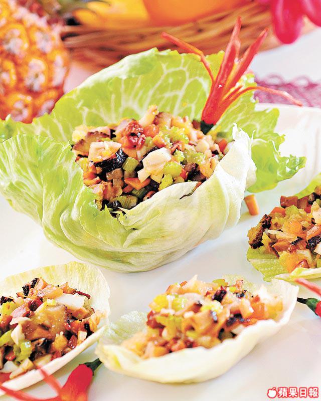 3.起鑊加少許油,用大火爆香冬菇、紅蘿蔔粒及馬蹄粒,加海參、鮑魚粒及雪耳炒香,再加蛋白粒、XO醬及芹菜粒,埋生粉水芡後熄火,放在生菜葉上便成。