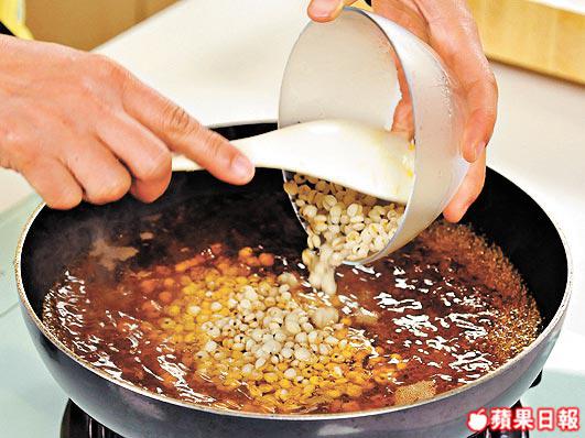 1.薏米加清水至剛蓋過面,浸1小時,然後連水倒入煲煲30分鐘,隔水備用。