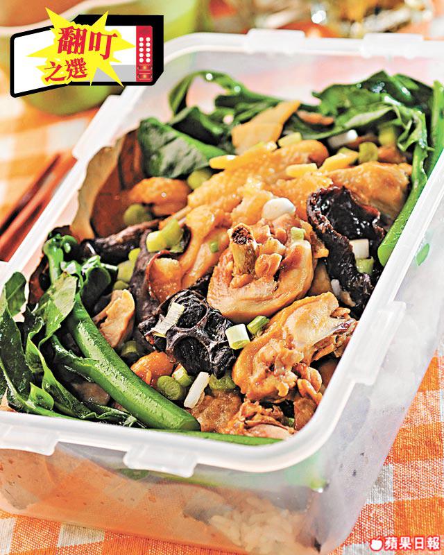 6.把荷葉鋪好在飯盒,放上飯,再放上蒸雞及另加幾條炒好的薑汁芥蘭,飯盒便完成。