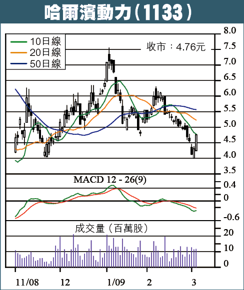 哈動歷史高價29.4元,現時4.76元,仲大跌83%,亦比每股資產淨值6.31港元為低。今年1月初,哈電高價7.55元,近日跌到4元才回升,以反彈前跌幅的0.5計,股價已可重上5.77元,升兩成。