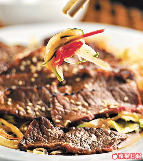 牛肉燒至半熟,肉質軟熟,用牛肉片捲着青瓜絲和洋葱絲,口感更佳。
