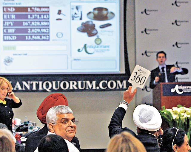 拍賣開始,現場有12人出價,連同電話和網上出價者,共約60人競投。印度商人不想國寶被外國人投得,出價絕不手軟,幾秒內就由起拍價1萬美元(7.8萬港元)暴升至50萬美元(390萬港元),兩分鐘內突破100萬美元(780萬港元),四分鐘後就以180萬美元成交,是估計最高成交價的六倍,連佣金大約要200萬美元(1,560萬港元)。