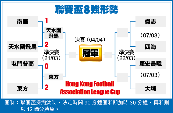 對於球隊今季3次輸給天水圍,羅氏解釋:「對手贏在士氣,佢哋存在目的只係贏南華,其他唔識贏。」天水圍隊長鄭少偉指球隊有針對性部署:「高波唔夠佢頂,我哋就專搶第2點。」天水圍晉級後,將會與頭場兩球擊敗屯門普高的東方爭決賽席位。本報訊