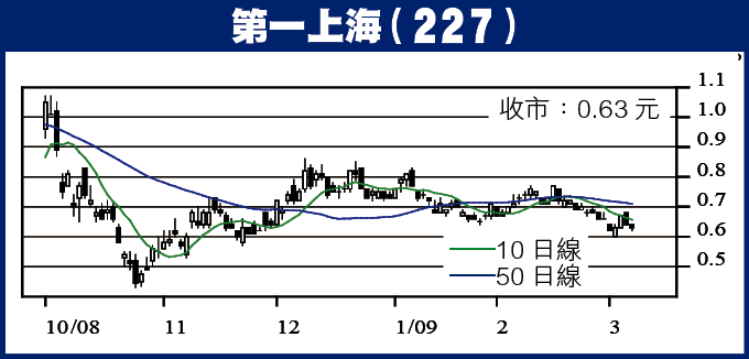 第一上海(227)上個月發盈警,預期08年度(12月底止)會盈轉虧。金融海嘯上年下半年吹到澎澎聲,影響到第一上海,一啲唔出奇。但要咁睇,第一上海最新每股淨現金0.47元,係現價(0.63元)75%,NAV折讓又高達66%,兩個數據,有唔錯嘅墊底作用。再講,阿爺呢期救市唔手軟,博阿爺推出有利中港股市經濟措施,第一上海肯定受惠。嚟轉短打,喺橫行區0.60元至0.86元炒上落,上下波幅講緊43%,咪話唔和味。