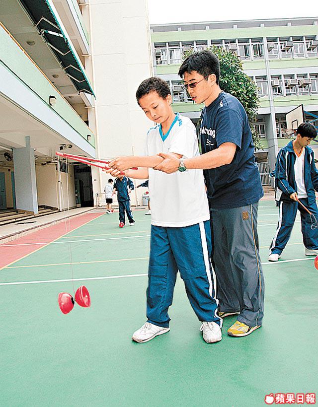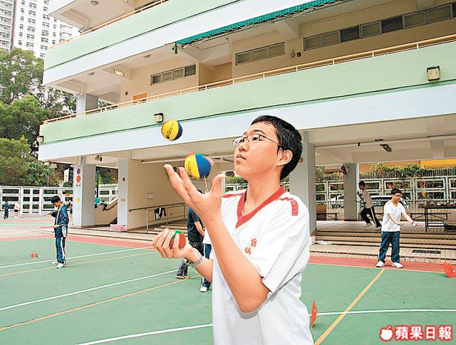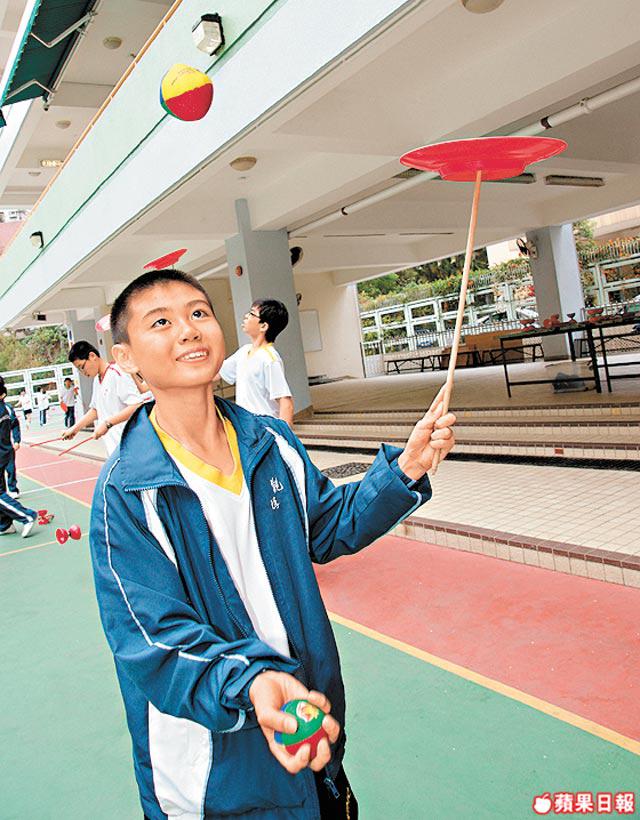 把雜藝列入中一中二常規體育課程,全靠曾接受簡單雜藝教學訓練的袁老師。「上完Course後,覺得可以引入體育課,令課堂更多元化,我只是他們的『大師兄』,部份花式從互聯網自學,希望學生像我一樣自學自創,青出於藍。」學生的反應不錯,可能與易掌握有關,連身為運動白癡的記者,花上15分鐘便能掌握轉碟技巧,比籃球、跨欄更好玩!