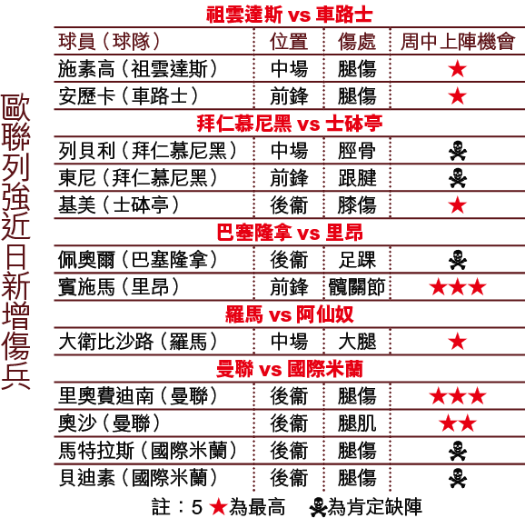 歐聯16強次回合明日展開,歐洲豪門國內賽事卻未見留力,導致傷兵湧現,曼聯、國際米蘭、車路士、巴塞隆拿及里昂傷得最重,眾十字兵正與時間競賽,盼及時在大戰中復出。