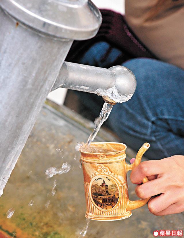 貴族們來這裏,除了欣賞中世紀留存下來的建築樣貌外,當然也為了泉水而來。根據當地醫學文獻,卡羅維瓦利的溫泉水具醫療功效,據聞只要飲足50杯,就可延年益壽,百毒不侵。溫泉水有不同的水溫,各水溫又具不同療效,最低溫度40℃泉水,專治排泄系統毛病,最高80℃則治消化系統毛病。一聽到可治療排泄,急不及待跑到出水口,探頭張口,嘩,燙的!死忍,再喝多口,很澀,但為了排清毒素身體好,只好揑緊鼻子強吞。忘了一提,要飲溫泉水,還得配合一隻溫泉杯,別像我以口作杯!全個溫泉區共有12個可飲用的出水口,要走遍12個出水口,還得用上大半日時間。