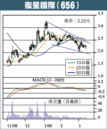 復星國際(656)盈利大幅倒退,但昨日股價未有太大反應,見低位2.15元後便反彈,收2.23元,只微跌5仙,由於年初已發盈警,股價對業績早已反映。