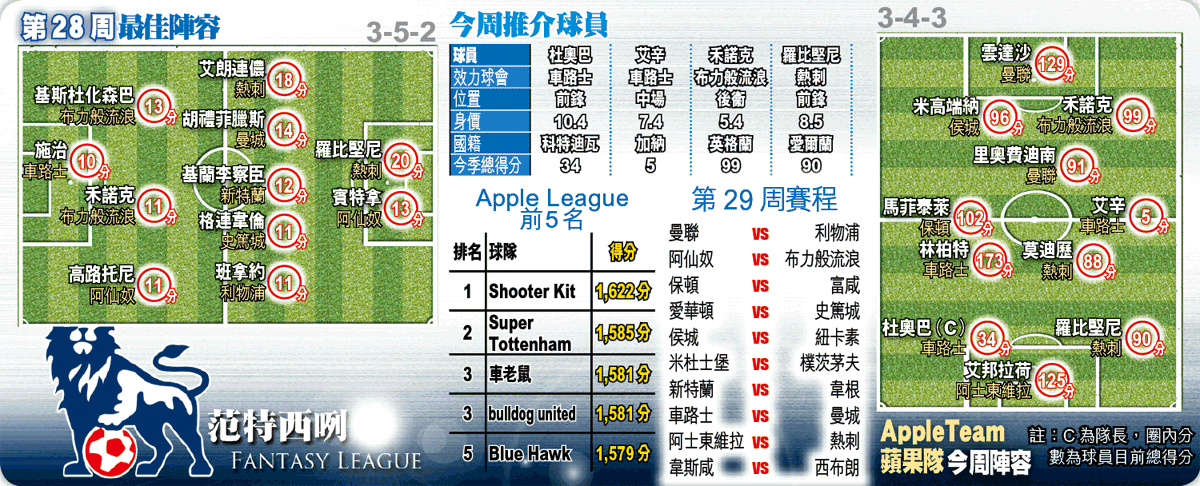 至於今周推介重點放在車路士身上,他們今周主場迎戰作客戰績平平的曼城,取勝可期。要數近期表現較佳的車仔球員,肯定是杜奧巴,這位科特迪瓦前鋒自從由新領隊軒迪克上任後,表現大有改善,除了上場聯賽對樸茨茅夫取得「士哥」外,連同英足盃及歐聯都有入球,腳風甚順,值得吸納。