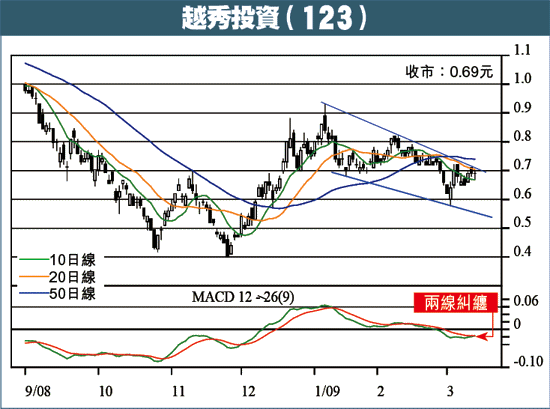 淡市之中昨日只有內房股表現較突出,可能有相關救市消息醞釀當中,但只宜快手快腳短炒。越秀投資(123)近月在0.70元水平橫行,如炒落後應尚有水位,較大阻力0.82元。