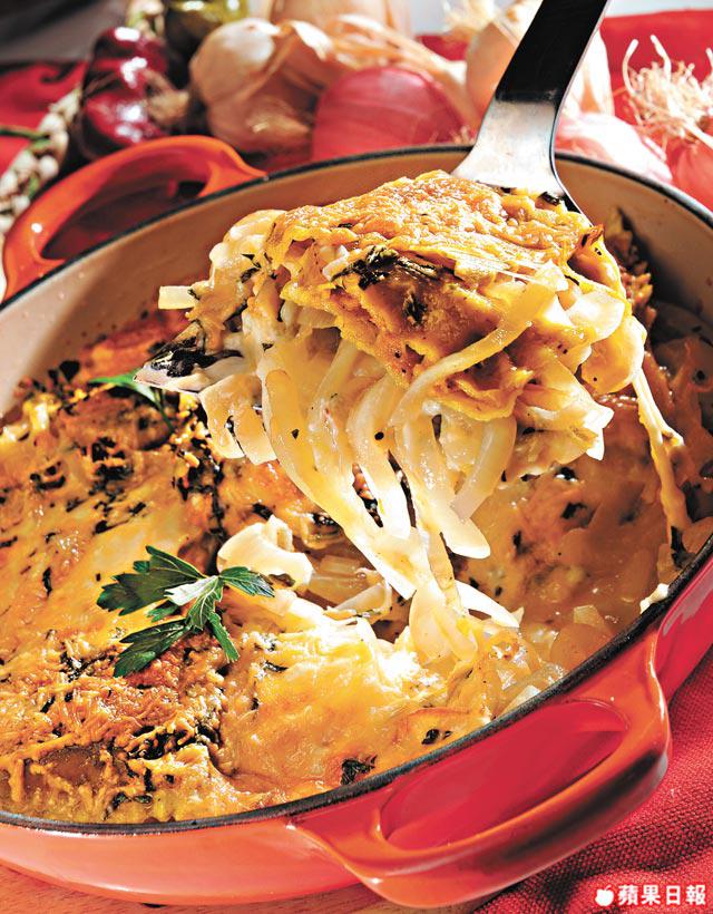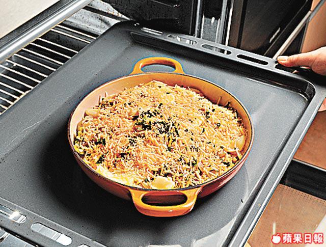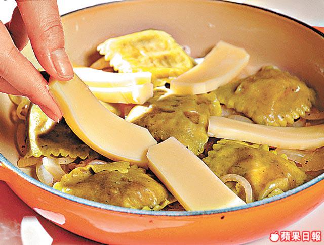 3.在焗盤上先塗牛油,然後依次序放半份洋葱絲、雲吞、Mozzarella芝士、芫荽碎及Parmesan芝士,掃上少許牛油,將剩餘半份材料鋪滿焗盤,入焗爐以190oC焗25分鐘。