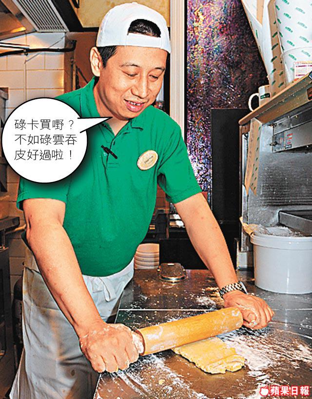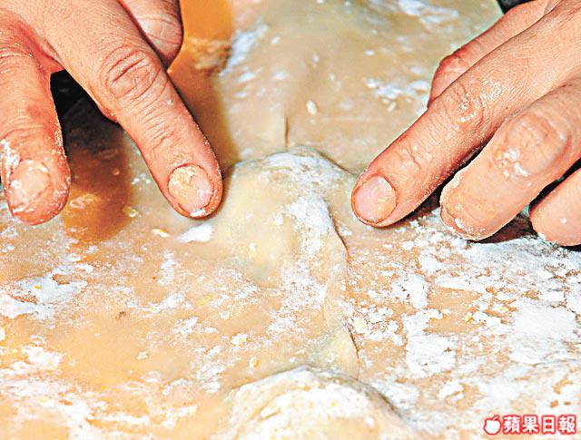 由於雲吞是凸起的,所以冚在上面的雲吞皮要較下面那塊大。