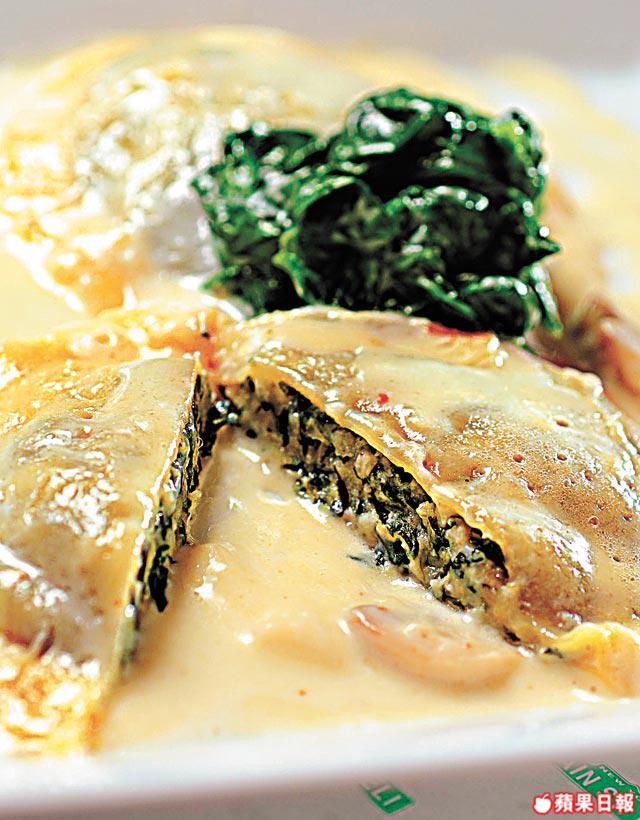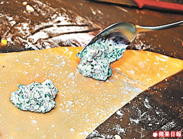 1.將菠菜葉烚熟,榨乾水後切碎粒,加入Ricotta芝士、忌廉芝士、鹽、黑胡椒碎及豆蔻粉撈勻成餡料。