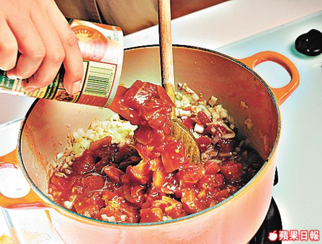 罐頭番茄味道偏酸,可用磅半的新鮮番茄代替,將番茄烚一烚去皮後切粒即可。