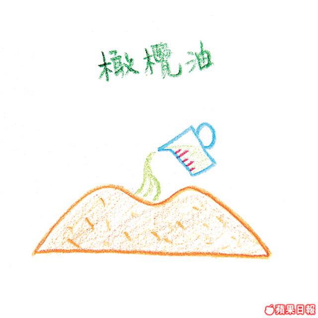 材料:中筋麪粉/高筋麪粉各500克、橄欖油200毫升、蛋1隻、水50至100毫升