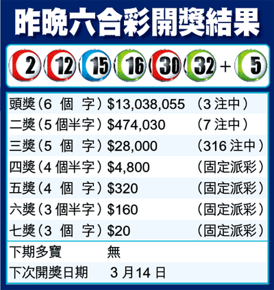 昨晚超級六合彩攪出的號碼,包括2、12、15、16、30、32,特別號碼5,頭獎基金高達4,000萬,皆因馬會上期動用金多寶儲備,舉行周二勁賞金多寶攪珠,結果當晚冇人中頭獎,有2,900萬多寶撥入昨晚攪珠,由於彩金巨大,令投注額高達7,925萬,除了頭獎三注中外,二獎亦有七注中,每人獲派47萬。