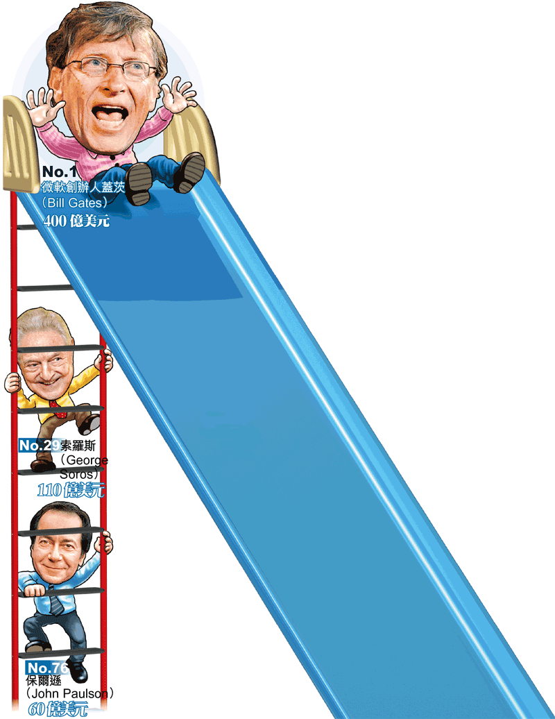 對冲基金經理保爾遜去年獨具慧眼,認定股市會崩盤,前年積極沽空次按債券致富,去年再沽空英國銀行股,令身家增加30億美元(234億港元),成為金融界的逆市大奇葩。數學大師西蒙斯利用他設計的數學模式經營對冲基金,令基金市值增加80%,身家大漲25億美元(195億港元)。愛興風作浪的金融大鱷索羅斯也沽空股票,令身家大漲20億美元(156億港元)。