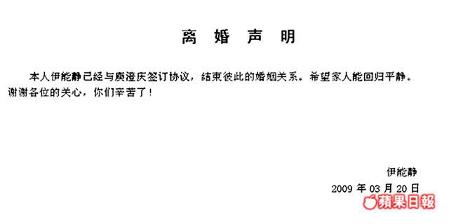 伊能靜昨透過內地的華誼兄弟公司率先發出聲明,內容寫道:「本人伊能靜已經與庾澄慶簽訂協議,結束彼此的婚姻關係,希望家人能回歸平靜。謝謝各位的關心,你們辛苦了。」其後哈林也以個人名義透過哈林音樂產房發聲明:「本人庾澄慶已經與伊能靜簽訂協議,結束彼此婚姻關係。希望家人能回歸平靜。謝謝各位媒體的關心,辛苦了。」