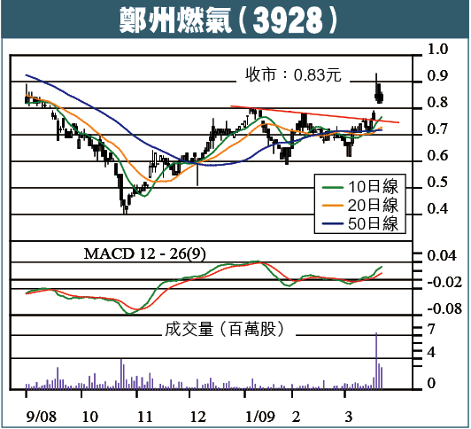鄭州燃氣(3928)去年業績理想,宣佈後股價有反應,由0.78元急衝上0.93元後才調整,噚日大市急挫,鄭燃仍能守住0.83元,逆市而升1仙,整固完成後,有力再上。