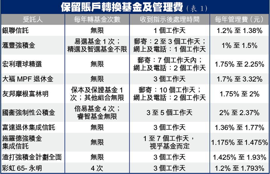本報向10間受託人查詢,多容許成員無限次轉換成份基金組合,惟部份受託人如友邦摩根富林明,保本及保證基金每年只可換一次,滙豐易選組合同樣只得一次,至於國衞倍易及彩虹65永明,一年有4次機會調配(表1)。