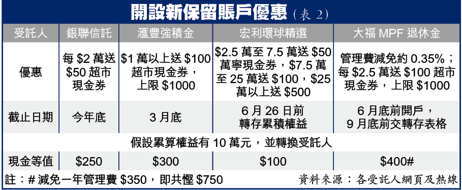 保留賬戶由成員話事,可以自由揀受託人,故受託人為吸納新客,不時推出優惠,現時銀聯信託、滙豐強積金、宏利環球精選和大福MPF退休金,都以銀彈攻勢大派現金券,其中大福更額外減免管理費。