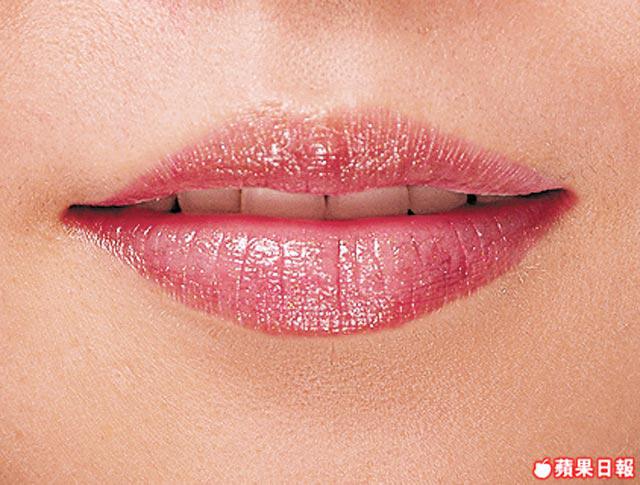 預先塗上粉紅偏橙色系唇膏,再塗上色唇彩,嘴色反之被淡化了,做到鮮而平均的唇色。