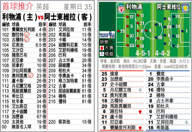 利物浦連贏皇家馬德里及曼聯後信心大增,加上一對攻擊孖寶謝拉特及費蘭度托利斯(費托)當「弗」,周日於英超夜場迎戰走勢下滑的阿士東維拉,可望再贏一場,「讓球主客和」[-1],必捧紅軍「主勝」。(球賽編號:星期日35;now632及660台直播今日11:59pm)青蛙仔
