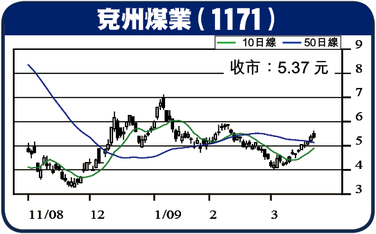 內地煤炭價格未有受到國際煤價下跌所影響,而且繼續有5至10%的升幅,主要是內地的政策仍然頗保護煤炭企業,兗煤08年之產能回升,預期08年盈利會有較明顯的增長外,相信09年盈利增長仍然可以維持。股價在上周上破50日線後,技術走勢出現突破,可望繼續向好,建議候調整至5.30元時買入,上望6元,跌穿4.80元沽出。