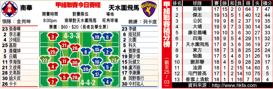南華目前在積分榜領先,羅傑承揚言再添5場勝仗便可提前衞冕聯賽錦標,今日對天水圍是南華的第一關。事實上,南華月初在聯賽盃8強遇天水圍,因要留力亞協盃,收起了數名主力,領先一球下最終被天水圍反勝2:1。