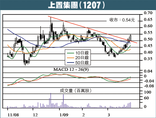 以上海為主力的上置集團(1207),昨日便成為大力追捧的對象,以0.54元高價收市,大升9.1%,成交再大增到3900多萬股,已係連續第3日大成交,動力強勁,250日線在0.76元,將係升勢的第一站。