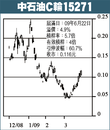 中石油C輪15271:中石油(857)昨收6.71元,升3.7巴仙,噚日嘅主角係內銀股,中石油升幅唔算大,不過,10日線啱啱升破100日線,應該好快會上試7.40元,破位睇8元,可以諗吓隻C輪15271,昨收11.6仙,有效槓桿4倍,正股升上8元,15271有機會見21.9仙,正股跌穿6.40元,就沽咗隻輪止蝕。