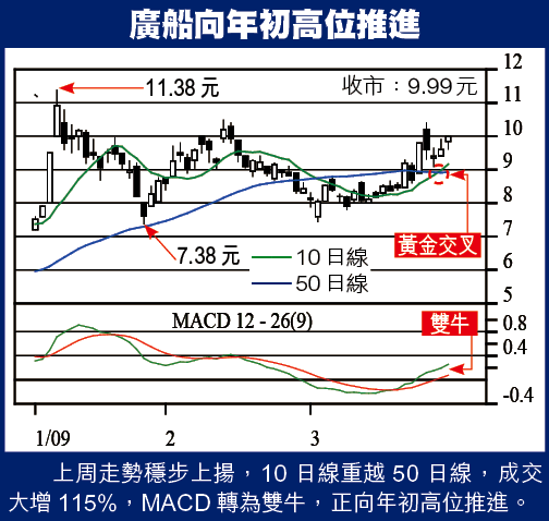 廣船上周中段曾升至10.40元,收9.99元,比前周升1.29元,日線圖出現黃金交叉,MACD初轉雙牛,蓄勢待發,首個目標是上試1月高位11.38元,下個目標是挑戰50周平均線正處的13.25元水平,潛在升幅33%!