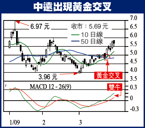 2)今周副選博中國遠洋控股(1919),絕非次貨。中遠上周五最高升至5.85元,收5.69元,短期動力未失,MACD初轉雙牛,10日線亦升越50日線,出現回升以來第2個黃金交叉,一旦突破6元大關,將可向今年1月反彈高位6.97元進發。