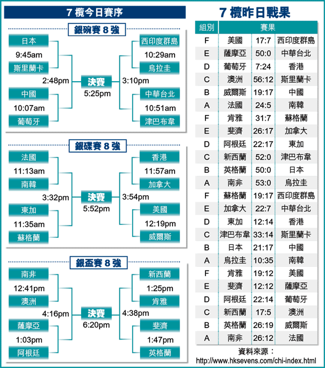 昨日的7欖未受天氣影響,加上周末效應,吸引近4萬名觀眾逼爆大球場。力圖衞冕的新西蘭昨日繼續發揮王者本色,先後以大比數擊退津巴布韋及澳洲,以3戰全勝姿態打入銀盃賽;由於8強對手只是實力一般的肯雅,故新西蘭晉身4強應不成問題。