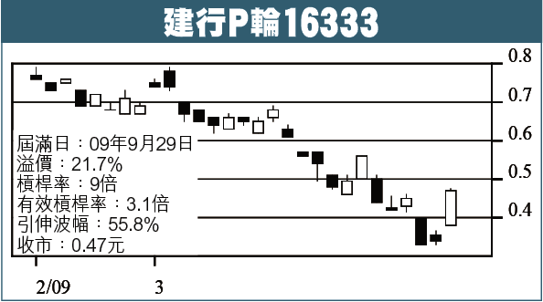 ■建行P輪16333收0.47元,升0.13元,成交57球。此輪09年9月29日到期,行使價3.80元,溢價21.7%,槓桿率9倍,有效3.1倍,引伸波幅55.8%。正股低見3.66元,此輪理論價0.696元,升48%。