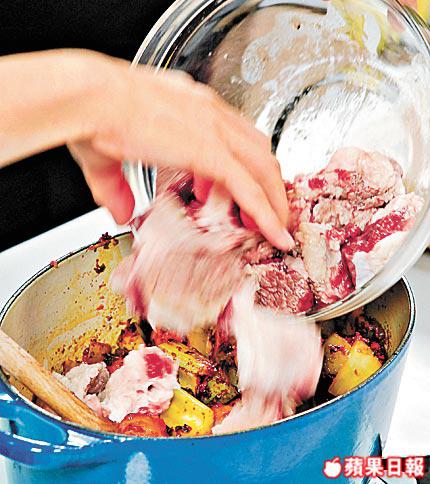 4.注入上湯煮滾,再加肉桂、紅椒粉、GaramMasala及牛腩炒勻,待煮滾後冚蓋用細火燜個半鐘至牛腩軟腍。