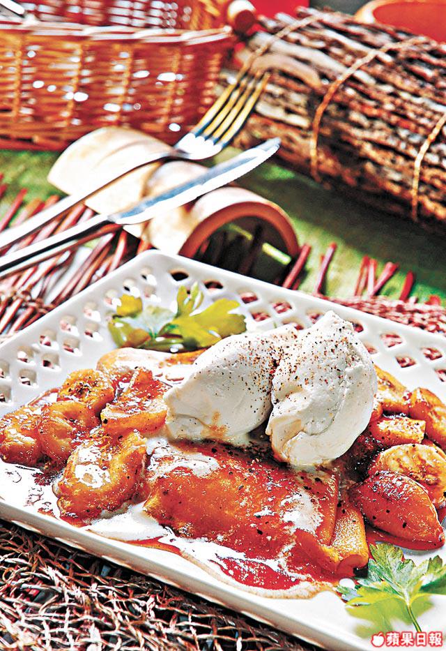 4.將黑糖放入平底鑊,加水煮滾,下呍呢拿油、粟膠及少許黑椒碎煮至稠成漿狀,下香蕉片及班戟燴一下,熄火上碟,最後放雪糕伴食即可。