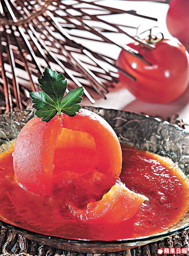 看似是冰鎮番茄沙律,其實內裏盛着番茄熱湯,一開番茄就會流出來。
