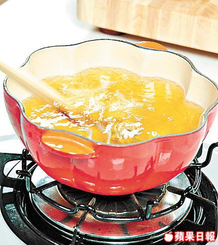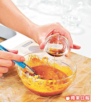 1.起鑊加少許油炒紅咖喱,煮出來會更香,盛起後放入碗內,然後加軟牛油、糖及魚露調味,用保鮮紙包好,放入雪櫃雪至硬實,取出挖成小球備用。