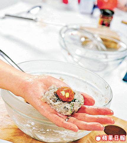3.手濕少許水,將1湯匙魚肉放於掌心,釀入一球咖喱牛油,包好後搓成球狀,放在已掃油的碟上備用。