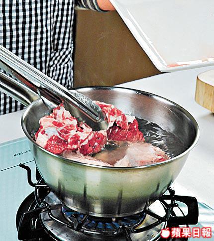 2.將牛腩放入滾水中略灼去肥油,取出切件,把過多的肥膏切走,否則會太肥膩。