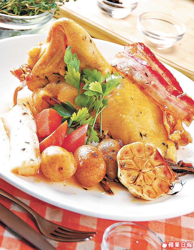 鮮雞1隻、大葱1棵、甘笋1條(切細塊)、蒜頭1個、乾牛肝菌10克、意大利煙肉4片(約150克)、新薯250克、百里香/橄欖油/海鹽/黑胡椒各少許