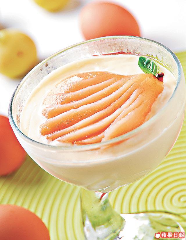 Prosecco香檳1杯、糖1杯、美國Anjou梨2個、薑20克、淡忌廉1杯、杏仁酒2湯匙、水1/4杯、蛋黃4個、檸檬1片