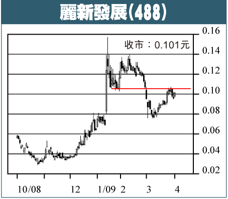 麗新發展(488)昨升5.2%,收報0.101元,重返「毫子股」行列。睇個款似乎會有一轉炒作,不妨小注怡情追入,短炒目標0.13元,跌穿0.08元止蝕。