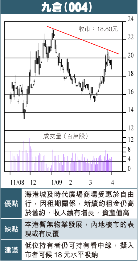 九倉現價18.80元,PE12.3倍,息率4.25%,PB0.52倍,條件相當合理,而資產折讓已過高,美中不足是本港暫無物業發展,但作為中長線,不失為理想投資對象。