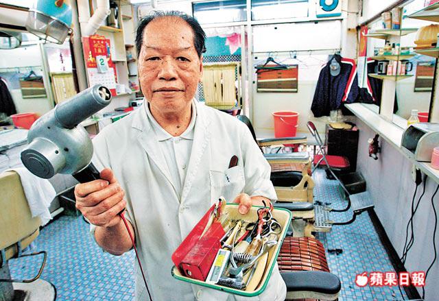 人去樓空,遺下的理髮刨、風筒,朱伯伯樂於交予「拍得起」社區藝術拍賣會另覓主人,更將電髮大風筒罩在記者頭上:「係咪好大風呢,仲得㗎。」吸引的還有門外轉個不停的花柱,店內兩張理髮椅早被「搶購」,記者瞄一瞄枱上剪刀,朱伯伯即正色道:「呢啲點都唔賣。」