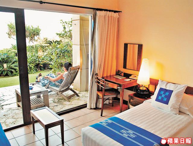 這裏沒有高爾夫車供代步,所以可體驗石垣人長壽秘笈第一章──多運動。從大堂回房間,快極要行五分鐘,還要行三層樓梯。來回起碼日行千步!房間用了我喜愛的紅,加上手繪琉球美女掛在電視頂,令人精神起來!開窗,眼前是一望無際的川平灣,據說石垣有七種藍,天似有深淺粉藍,海又有帶綠的藍,還有呢?「喂,出去未?」原來是鄰房的May,只要伸出頭,便可sayhi!