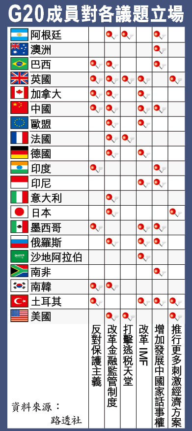 G20峯會於香港時間今天下午4時召開,領袖將為如何消弭分歧拯救全球經濟絞盡腦汁。峯會前夕,英美繼續主張注資刺激全球經濟,但法德反對,堅持進行全球金融監管改革更重要。美國總統奧巴馬昨天與英國首相白高敦(GordonBrown)舉行早餐會,會後都致力淡化分歧。但法國總統薩爾科齊聲言G20至昨天仍未達成具體協議。