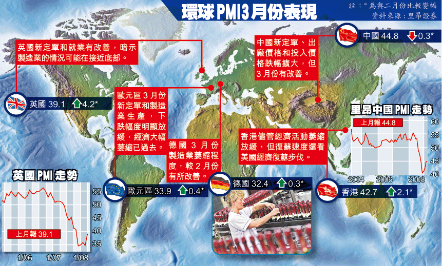 【本報訊】中國、美國及歐元區全球三大經濟體的製造業數據,出現萎縮放緩現象,顯示經濟初露曙光。雖然里昂證券公佈3月份中國製造業採購經理指數(PMI)扭轉去年11月份開始升浪,但3月份出口定單回升,美林和中金預期將公佈3月份中國官方PMI指數可重回榮衰線50點或以上,有望結束萎縮。 記者:周燕芬